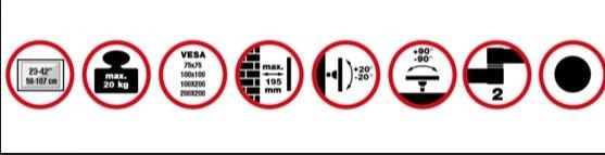 Nástenný držiak pre LCD monitory a televízory s uhlopriečkou 23"- 42" (58-107 cm) a maximálnou hmotnosťou 20 kg. 2x záves, vertikálne výklopný +20°/-20° a horizontálne otočný +90°/-90°, vzdialenosť od steny 82-195 mm, materiál oceľ, farba čierna. Montáž VESA: 75x75, 100x100, 100x200, 200x200...
