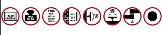 Nástenný držiak pre LCD monitory a televízory s uhlopriečkou 23"- 42" (58-107 cm) a maximálnou hmotnosťou 20 kg. 3x záves, vertikálne výklopný +20°/-20° a horizontálne otočný +90°/-90°, vzdialenosť od steny 82-392 mm, materiál oceľ, farba čierna. Montáž VESA: 75x75, 100x100, 100x200, 200x200...