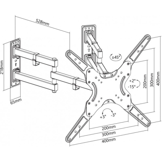 Nástenný oceľový držiak do rohu miestnosti na LCD monitory a TV s uhlopriečkou 23"- 55" (58-140cm) a hmotnosťou maximálne 45kg. 2x2 pánty, vertikálne výklopný +2°/-15° a horizontálne otočný +45°/-45°, pre Curved TV, Cable Management, materiál oceľ, farba čierna. Uchytenie VESA: 100x200, 200x200, 300x200, 300x300, 400x200, 400x300, 400x400.