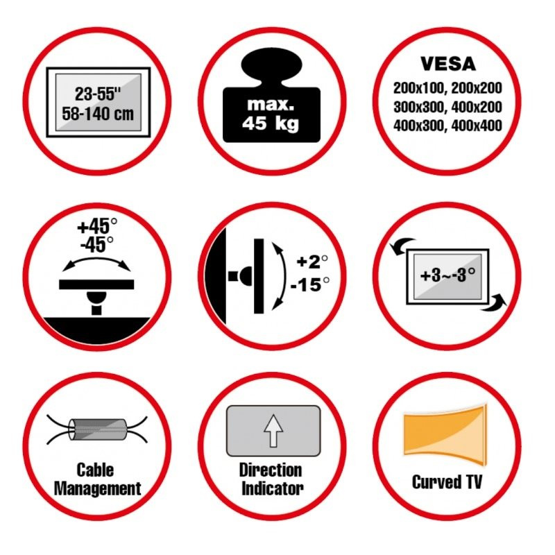Nástenný oceľový držiak do rohu miestnosti na LCD monitory a TV s uhlopriečkou 23"- 55" (58-140cm) a hmotnosťou maximálne 45kg. 2x2 pánty, vertikálne výklopný +2°/-15° a horizontálne otočný +45°/-45°, pre Curved TV, Cable Management, materiál oceľ, farba čierna. Uchytenie VESA: 100x200, 200x200, 300x200, 300x300, 400x200, 400x300, 400x400.
