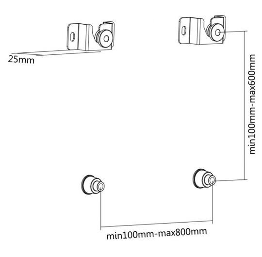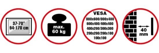 Cenovo výhodný nástenný oceľový držiak SLIM s minimálnou vzdialenosťou od steny na Plasma a LCD TV s uhlopriečkou 37"- 70" (94-178cm) a hmotnosťou maximálne 60kg. Bez konzoly (len úchyty) na zavesenie TV s upevnenými držiakmi - protikusy, dolné distančné prvky. Nie je vertikálne výklopný, vzdialenosť od steny 40mm, materiál oceľ, farba čierna. Uchytenie VESA: 100x100, 100x200, 200x200, 400x200, 400x400, 600x400, 600x600, 800x600.