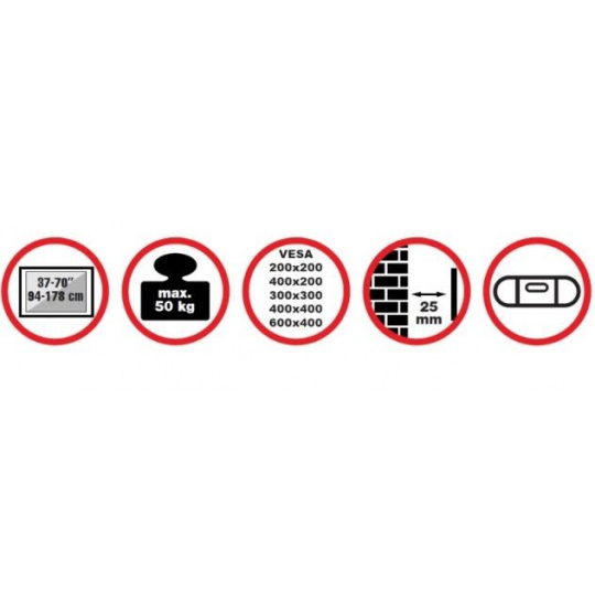 Nástenný oceľový držiak na Plasma a LCD TV s uhlopriečkou 37"- 70" (94-178cm) a hmotnosťou maximálne 50kg. Konzola na zavesenie TV s vodováhou, nie je vertikálne výklopná, vzdialenosť od steny 25mm, materiál oceľ, cenovo dostupné, farba čierna. Uchytenie VESA: 200x200, 400x200, 300x300, 400x400, 600x400.