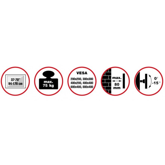 Nástenný oceľový držiak na televízory LCD s uhlopriečkou 37"- 70" (94-178cm) a hmotnosťou maximálne 75kg. Upevnenie VESA až 800x400, Stredová konzola na zavesenie TV s upevnenými držiakmi, vertikálne výklopný +0°/-15°, vzdialenosť od steny 80mm, farba strieborná. Upevnenie VESA 200x200, 300x300, 400x200, 400x400, 600x400 a 800x400.