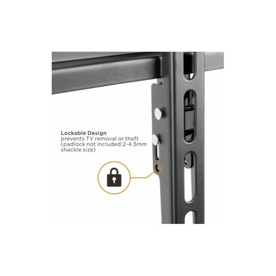 Nástenný oceľový držiak na veľké televízory s uhlopriečkou 37"- 75" (94-190cm) a hmotnosťou maximálne 75kg. Konzola na zavesenie TV s upevnenými držiakmi vertikálne, VESA max 400x600, nie je výklopný, vzdialenosť od steny 27mm, rozmery 44,8x62,5x2,7cm, farba čierna. Uchytenie VESA: 200x200, 300x200, 300x300, 400x200, 400x300, 400x400, 400x600.