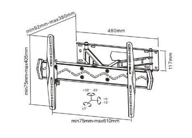 Nástenný oceľový držiak s bočným natáčaním na Plazma a LCD TV s uhlopriečkou 37"- 70" (94-178cm) a hmotnosťou maximálne 50kg. Uchytenie VESA: 200x200, 400x200, 300x300, 400x400, 600x400. Popis: 3x pánt, vertikálne výklopný +10°/-20° a horizontálne otočný +90°/-90°, vzdialenosť od steny 62-475mm, vodováha, materiál oceľ, farba čierna.