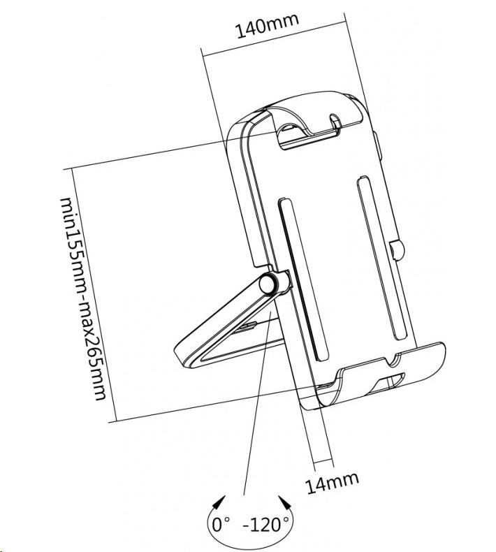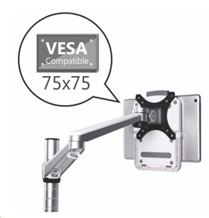 Tenký Slim stojánek pro tablety 7-10,1"/17-26cm max 1kg v horizontální i vertikální poloze na stůl, zeď a pomocí magnetů na kovovou plochu. VESA 75x75, 2x otvory pro uchycení vruty, fixace tabletu ze dvou stran, lehké plastové provedení pro transport, rozměry 19,7x14x3,6cm, šedý / bílý.