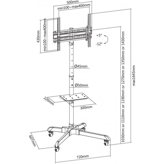 Televízny stolík na veľké TV s uhlopriečkou 32"- 55" (81-140cm) a hmotnosťou maximálne 35kg. Stredová nosná tyč 103-143cm na kolieskach s aretáciou, držiak vertikálne výklopný +5°/-12°, police 22x30cm max 5kg, Cable managment, rozmery 72x60,7x164,3cm, materiál oceľ, farba čierna. Uchytenie VESA: 100x100, 200x100, 200x200, 300x200, 300x300, 400x200, 400x400.
