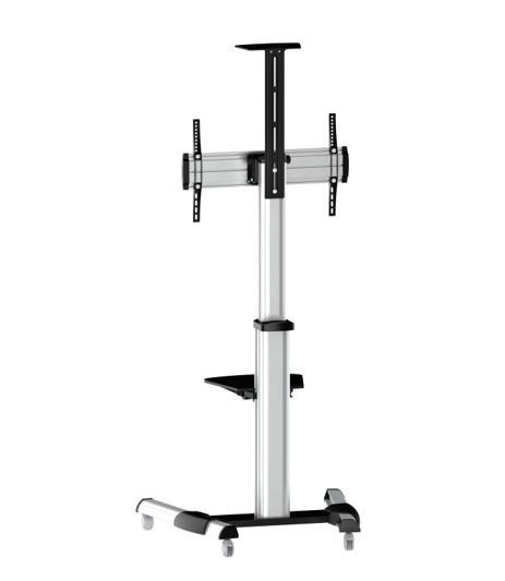 Moderný televízny stolík na Plasma a LCD TV s uhlopriečkou 37"- 70" (94-178cm) a hmotnosťou maximálne 50kg. Stredová teleskopická nosná tyč na kolieskach, držiak otočný o 90° a vertikálne výklopný +5°/-12°, horná výškovo nastaviteľná plocha pre kameru, polička, AluDesign, farba strieborná. Uchytenie VESA: 200x200, 300x300, 400x200, 400x400, 600x400.