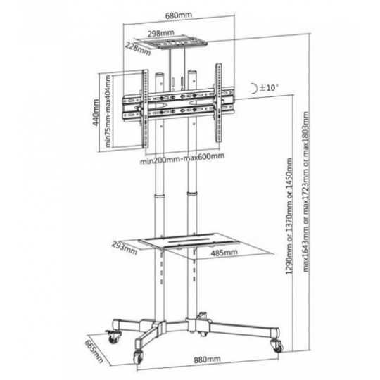 Televízny stolík na Plasma a LCD TV s uhlopriečkou 37"- 70" (94-178cm) a hmotnosťou maximálne 50kg. 2x stredová nosná tyč na kolieskach, držiak vertikálne výklopný +10°/-10°, horná výškovo nastaviteľná plocha pre kameru, polička, materiál oceľ, farba čierna. Uchytenie VESA: 200x200, 300x300, 400x200, 400x400, 600x400.