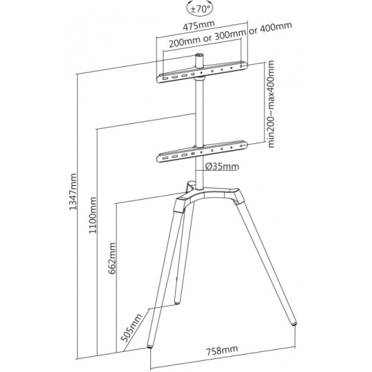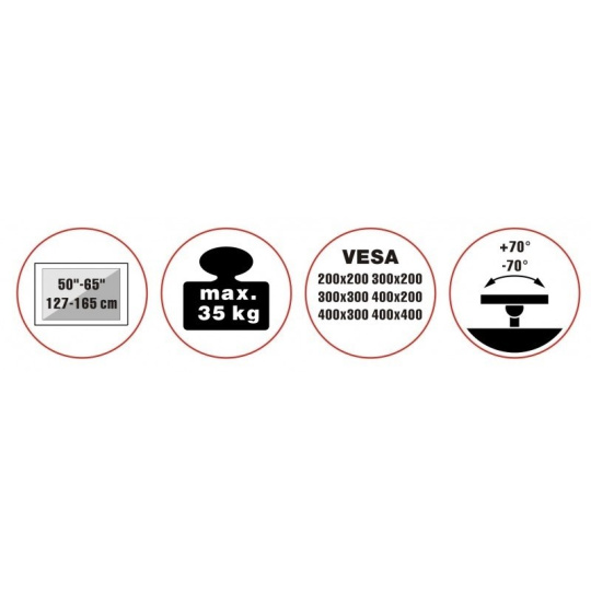 Unikátny televízny stolík na Plasma a LCD TV s uhlopriečkou 50"- 65" (127-165cm) a hmotnosťou maximálne 35kg. Dizajnová kombinácia čiernej kovovej konštrukcie + 3x drevené nohy (orech). Precízne tvarované a vedené káble pre maximálny estetický zážitok. Upevnenie VESA: 200x200, 300x200, 300x300, 400x200, 400x400.