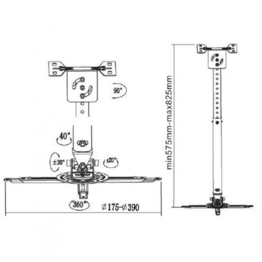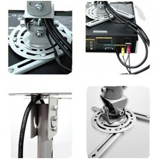 Stropný držiak na dataprojektory - vzdialenosť od stropu 57,5-82,5cm, prístroj je možné otočiť o 360° a nakloniť +/-20°, maximálne zaťaženie 20kg, možnosť naklopenia nosnej tyče - vhodné na šikmé plochy, strieborný. Univerzálny systém uchytenia dataprojektorov ( rozsah 16-33 cm ).