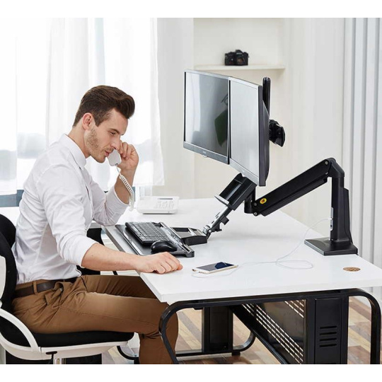 Profesionálny stolový držiak na 2 monitory 17-27" s policou na klávesnicu a myš, ergonomický pre prácu vo vzpriamene alebo vsed E s jednoduchým a rýchlym výškovým polohovaním 480 mm. Monitory je možné na držiaku posúvať do strán, naklápať, otočiť na šírku alebo na výšku, mierne natáčať do strán, výškovo polohovať. Extrémne jednoduché výškové polohovanie celého držiaku vďaka plynové pružine, počas okamihu môžete zmeniť pozíciu vsed E na pozíciu vstoje a otočiť držiak do strán +/- 180°. Profesionálna kvalita s dôrazom na dizajn, 2x USB porty 3.0, systém pre vedenie káblov, jednoduchá inštalácia na stolové dosky o priemere 10-95mm. Farebné prevedenie čierne, záruka 3 roky.