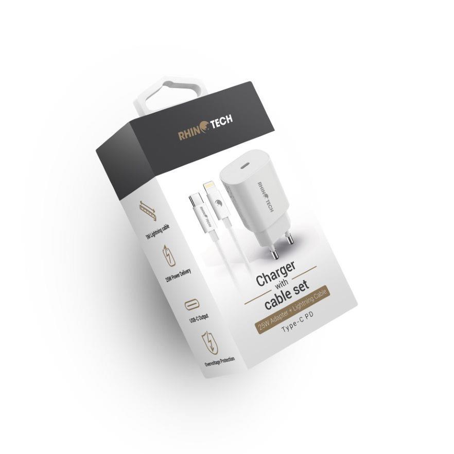 RhinoTech praktický set rychlonabíjecího adaptéru (25W) a USB-C na Lightning kabelu (27W), pro bezpečné a rychlé nabíjení Vašeho zařízení.