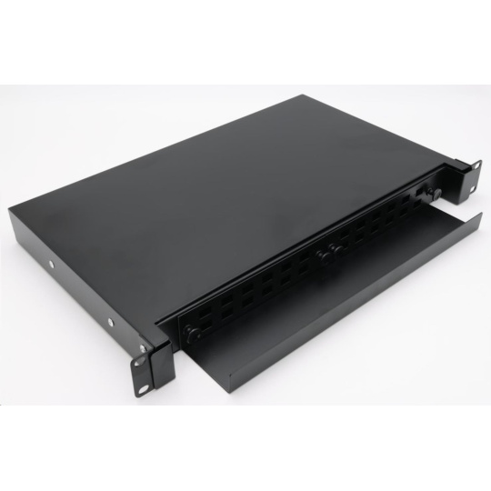 19" rozvádzač, výška 1U, pre 24 simplex adaptérů SC alebo duplexných LC, farba čierna, kovová skrinka, kazeta na zvarky. Van sa vysúva pomocou posuvných koľajníc.