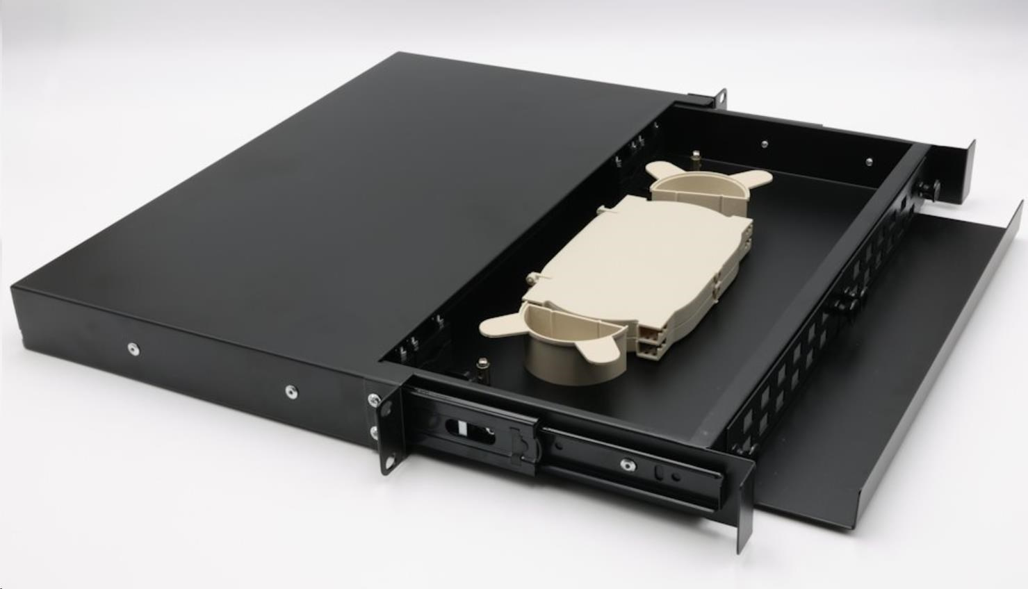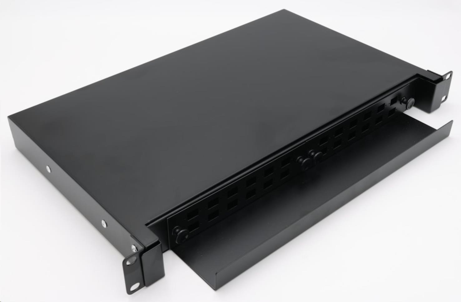 19" rozvádzač, výška 1U, pre 24 simplex adaptérů SC alebo duplexných LC, farba čierna, kovová skrinka, kazeta na zvarky. Van sa vysúva pomocou posuvných koľajníc.