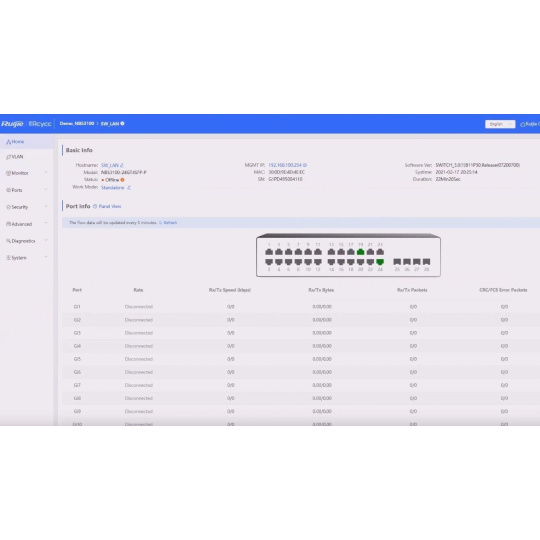 Popis produktu Inteligentní cloudově i přes webové rozhraní spravovatelný Enterprise L2 chytrý rackmount PoE switch RG-NBS3100-48GT4SFP-P od značky Ruijie, nabízí řešení s 48 Gigabit LAN porty, které podporují 802.3af/at PoE s celkovým PoE budgetem 370 W a 4 SFP porty. Tento switch je ideální pro síťové aplikace, které vyžadují výkon, spolehlivost a vysoký počet portů. Co se výčtu funkcí týče, switch nabízí podporu VLAN, DHCP snooping, RSTP, IGMP, SNMP, agregaci portů, testování kabelu a další. Klíčové vlastnosti • 48× 10/100/1000 Mbps LAN port • 4× SFP port • 48× 802.3af/at PoE - max. 30 W/port, PoE budget 370 W • Kvalitní rackmount provedení, kovové šasi • 2× Ventilátor s adaptivní rychlostí • Správa přes webové rozhraní a cloud • Celoživotní správa na Ruijie Cloud kdykoli a kdekoli • Rozpoznávání IP kamer - jedinečná hodnota pro CCTV síť • Podpora Jumbo packetů Obsah balení • Zařízení • Úchyty do 19" racku • Napájecí kabel Technické parametry Konektory a rozhraní Rychlost LAN:(48) 10/100/1000Mbps Optické rozhraní:(4) 1000Mbps Napájení Typ napájení:Ze sítě (230V) Typy PoE:PoE-Out (pouze) Podporované PoE-Out standardy:802.3af, 802.3at Počet PoE Out portů:48 PoE budget [W]:370 Max. spotřeba energie [W]:448 Napájení přes konektor/svorkovnici:230V AC Fyzické charakteristiky Provedení:Rackmount Ventilátory:(2) 40 x 40 mm Šasi:Kovové Tlačítka:Reset Provozní teplota [°C]:0 až 50 Šířka [mm]:440 Výška [mm]:44 Hloubka [mm]:358 Obecné Rychlost přepínání [Gbps]:104 Tabulka MAC adres:16000 Jumbo rámec [Bytes]:9216 Rychlost předávání paketů [Mpps]:77,4 Software Web management:Ano Management:Webové rozhraní, Ruijie cloud Funkce:VLAN, DHCP snooping Výchozí IP adresa:10.44.77.200 Výchozí jméno a heslo:Nastavuje se při prvním spuštění.