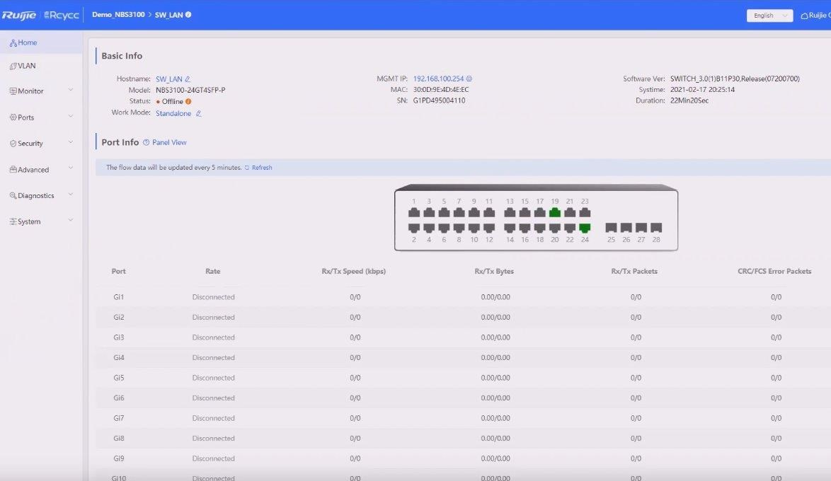 Popis produktu Inteligentní cloudově i přes webové rozhraní spravovatelný Enterprise L2 chytrý rackmount PoE switch RG-NBS3100-48GT4SFP-P od značky Ruijie, nabízí řešení s 48 Gigabit LAN porty, které podporují 802.3af/at PoE s celkovým PoE budgetem 370 W a 4 SFP porty. Tento switch je ideální pro síťové aplikace, které vyžadují výkon, spolehlivost a vysoký počet portů. Co se výčtu funkcí týče, switch nabízí podporu VLAN, DHCP snooping, RSTP, IGMP, SNMP, agregaci portů, testování kabelu a další. Klíčové vlastnosti • 48× 10/100/1000 Mbps LAN port • 4× SFP port • 48× 802.3af/at PoE - max. 30 W/port, PoE budget 370 W • Kvalitní rackmount provedení, kovové šasi • 2× Ventilátor s adaptivní rychlostí • Správa přes webové rozhraní a cloud • Celoživotní správa na Ruijie Cloud kdykoli a kdekoli • Rozpoznávání IP kamer - jedinečná hodnota pro CCTV síť • Podpora Jumbo packetů Obsah balení • Zařízení • Úchyty do 19" racku • Napájecí kabel Technické parametry Konektory a rozhraní Rychlost LAN:(48) 10/100/1000Mbps Optické rozhraní:(4) 1000Mbps Napájení Typ napájení:Ze sítě (230V) Typy PoE:PoE-Out (pouze) Podporované PoE-Out standardy:802.3af, 802.3at Počet PoE Out portů:48 PoE budget [W]:370 Max. spotřeba energie [W]:448 Napájení přes konektor/svorkovnici:230V AC Fyzické charakteristiky Provedení:Rackmount Ventilátory:(2) 40 x 40 mm Šasi:Kovové Tlačítka:Reset Provozní teplota [°C]:0 až 50 Šířka [mm]:440 Výška [mm]:44 Hloubka [mm]:358 Obecné Rychlost přepínání [Gbps]:104 Tabulka MAC adres:16000 Jumbo rámec [Bytes]:9216 Rychlost předávání paketů [Mpps]:77,4 Software Web management:Ano Management:Webové rozhraní, Ruijie cloud Funkce:VLAN, DHCP snooping Výchozí IP adresa:10.44.77.200 Výchozí jméno a heslo:Nastavuje se při prvním spuštění.