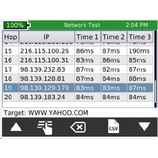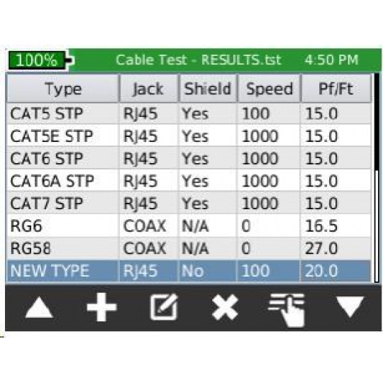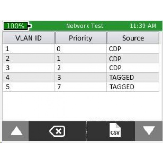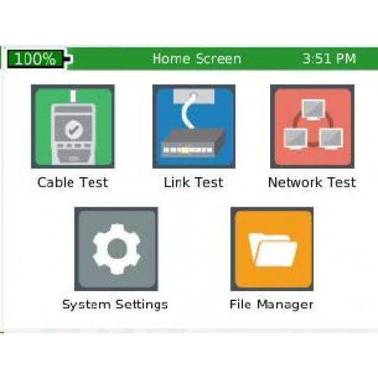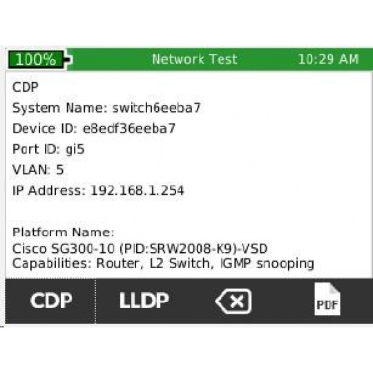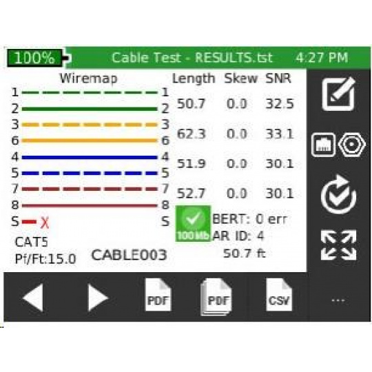 Identifikuje chyby v kábli (nesprávne zapojenie, vymenené páry, vzdialenosť od neukončeného kábla, skraty a poruchy s vysokým odporom.Testy je možné uložiť ako súbory PDF alebo CSV pre jednoduchú dokumentáciu.