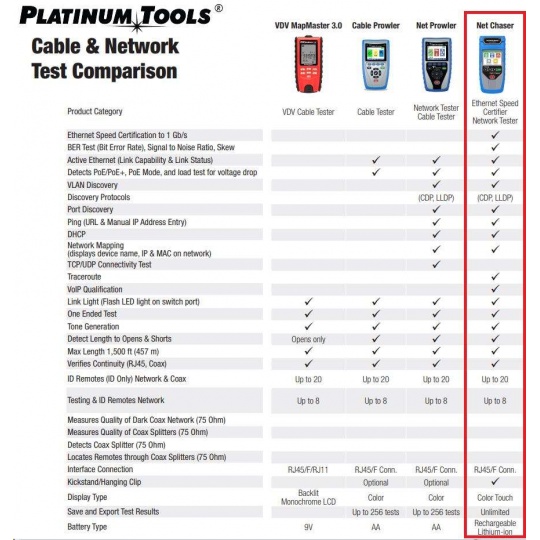 Stránky produktov: https://www.platinumtools.com/products/kits/net-chaser-ethernet-speed-certifier-network-tester-tnc950ar/ Manuál