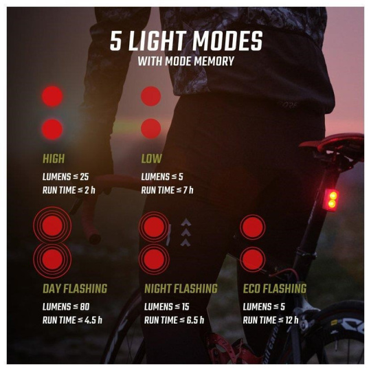 Kompaktné, ľahké a napriek tomu plné sily. Zadné svetlo Buster RL 80 je univerzálnym spoločníkom vo všetkých situáciách. Nezáleží na tom, či jazdíte na bicykli po ceste alebo v lese, s 80 lumenmi a dosvitom až 1500 metrov je toto kompaktné svetlo neprehliadnuteľné. Zadné svetlo s nabíjateľnou integrovanou batériou disponuje piatimi svetelnými režimami a môže svietiť až 12 hodín. Týchto päť svetelných režimov vrátane režimu Flash pre deň aj noc zvyšuje viditeľnosť a zabezpečuje vyššiu bezpečnosť v cestnej premávke.