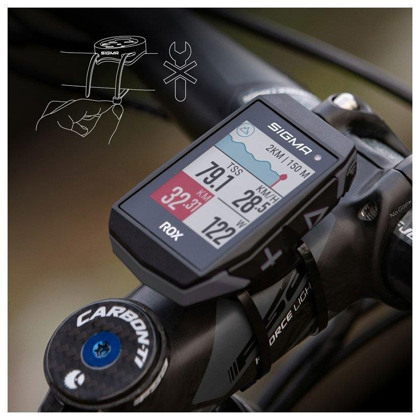 Držiak môže byť počas pár sekúnd upevnený pomocou dvoch káblových pásikov na riadidlá alebo predstavec. Je vhodný pre celý rad SIGMA ROX a je možné ho upevniť na všetky typy riadidiel.