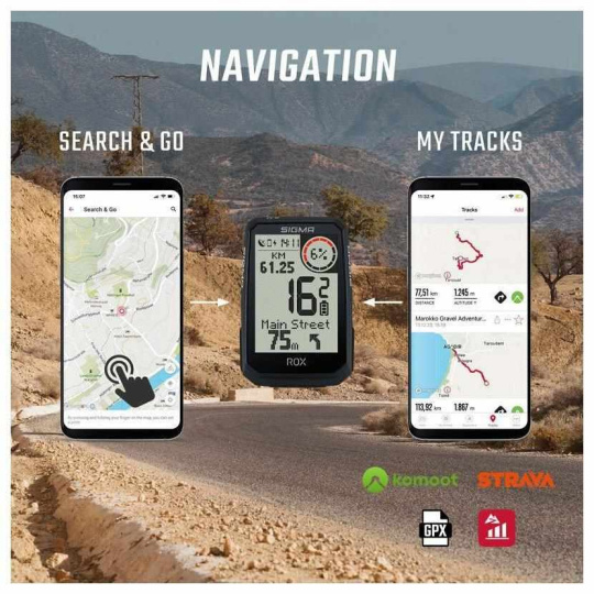 Vďaka navigácii „Search & Go“ môžete rýchlo nájsť akékoľvek miesto na mape a následne mu naplánovať trasu. Ak to chcete urobiť, musíte zadať adresu do aplikácie SIGMA RIDE vo svojom smartfóne alebo kliknúť na ľubovoľný bod na mape. Je možné individuálne nastaviť preferencie ciest (cyklotrasy, nezpevnené cesty, bežné cesty a pešie chodníky/turistické trasy). Vytvorenú trasu je možné spustiť priamo na počítači ROX 4.0 Endurance alebo uložiť na neskoršie použitie v aplikácii SIGMA RIDE.