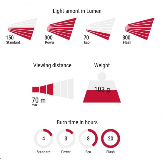 So štyrmi rôznymi režimami môže byť intenzita osvetlenia optimálne prispôsobená. Svetlo má 3 režimy svietenia: intenzívny 300 lm / štandardný 150 lm / ekonomický 70 lm a blikajúci režim.