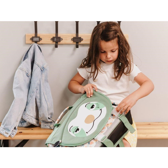 Aktovka (školský batoh) v neutrálnih farbách, s rozkošným lenochodom, je ideálnou školskou taškou pre prvákov. Veľký vnútorný priestor, do ktorého deti pohodlne uloží aj sešity vo formáte A4, 2 vnútorné priehradky, vnútorná kapsa na zips, všetko to uľahčí novopečeným školáčkom prípravu a upratovanie školských potrieb. Samozrejmosťou sú polstrované ramenné pásy, pútko, štítok na meno aj reflexné prvky.