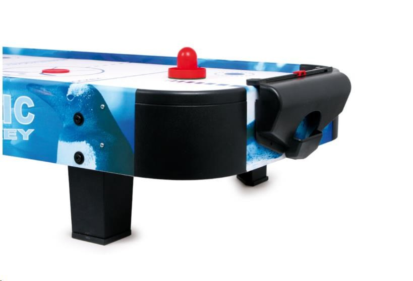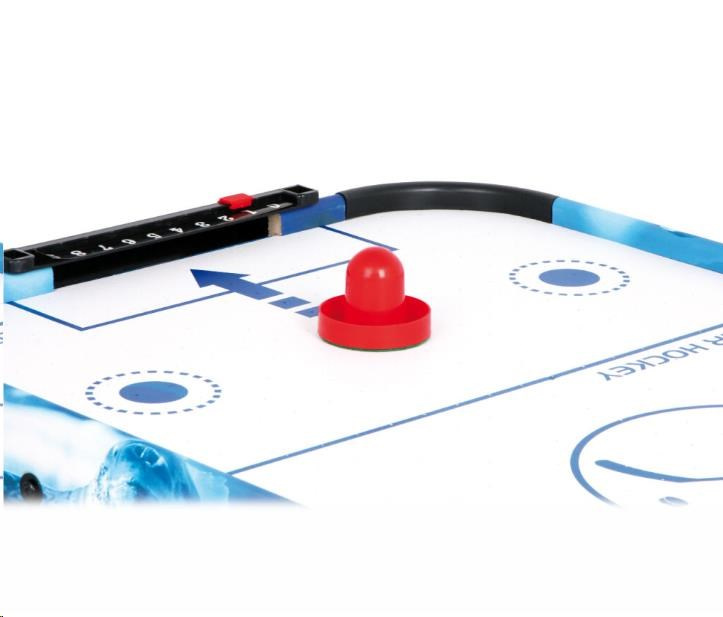 Populárny vzdušný hokej preverí pohľad a rýchlosť detí. Vďaka vzduchu vháňanému zospodu zabudovaným ventilátorom môže puk hladko, ale hlavne bleskurychle kĺzať po hernej ploche. Hráči majú k dispozícii kuželové palice, ktorými sa snažia vsrieť puk do súperaovej bránky. Palice sú na spodnej strane opatrené filcom pre jednoduchý a tichý pohyb. Bránka každého z hráčov je vybavená jednoduchým číselníkom na zaznamenávanie priebehu zápasu. Hru možno vďaka jej veľkosti ľahko odložiť, prenášať, alebo aj vziať na cesty. Napájanie je zabezpečené adaptérom so štandardnou európskou zástrčkou na 220–240 V. Výrobok vyžaduje montáž, dodávaný s obrázkovým návodom na zostavenie.