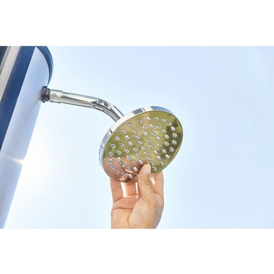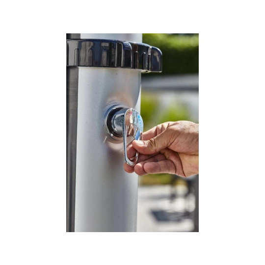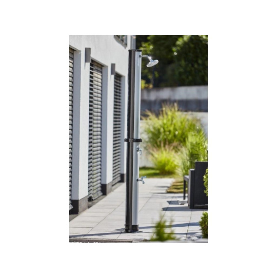 Rodinami obľúbená solárna sprcha s XXL zásobníkom o objeme 40 l a veľkým sprchovacím hlavicou, ktorá zabezpečuje príjemné sprchovanie pripomínajúce ľahký letný lejak. Sprcha je vyrobená z kvalitného PVC odolného voči UV žiareniu. Elegantný vzhľad sprchy podčiarkuje čelná časť imitujúca nerez. Sprcha je vysoká 220 cm a je vybavená praktickým kohútikom na oplach nôh. Pripojenie na prívod vody je veľmi jednoduché pomocou hadicovej rýchlospojky (súčasť balenia).