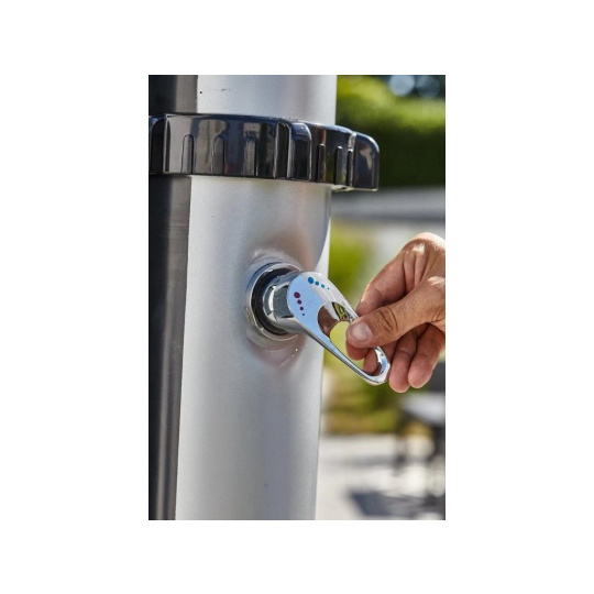 Solárna sprcha je ideálny zdroj teplej vody bez použitia elektriny. Voda je v solárnom zásobníku jednoducho ohrievaná slnečným žiarením až na 60°C. K tomu prispieva aj čierne prevedenie sprchy. Sprcha je vybavená miešacou pákovou batériou, aby ste si nastavili teplotu vody, ktorá vám bude vyhovovať.