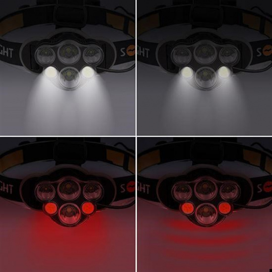 nabíjacia LED čelová svietidlo s bielym a červeným svetlom svietivosť: max. 550lm 8 režimov svietenia: 4x základné režimy + 4x pridavné režimy* 6x predná LED dióda 1x zadná LED dióda so samostatným vypínačom outdoorové použitie (stupeň krytia IP44) výdrž batérií min/max: 4hod./16hod. doba nabíjania: 9hod. napájanie: 2x batérie 18650 3.7V 2200mAh Li-on nabíjanie: micro USB farba: čierna * pre aktiváciu pridavných režimov svietenia dlho podržte tlačidlo