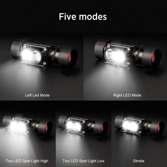 - 5 režimov svietenia: pravá LED 100%, ľavá LED 100%, obe LED 100%, obe LED 50%, blikanie