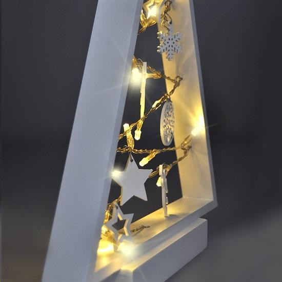 < translated >LED drevený vianočný stromček s ozdobami počet LED diód: 15 počet ozdôb: 7 farba svetla: teplá biela (žltá) napájanie: 2 x AA batérie (nie sú súčasťou) výdrž batérií: cca 75 hodín (v závislosti od kvality batérií) trieda ochrany: IP20 (vnútorné použitie) rozmer: 37 x 25cm farba: biele drevo balenie: farebná krabica < /translated >