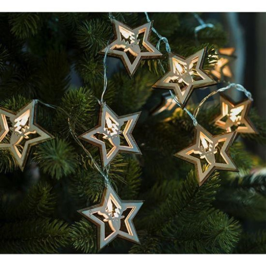 Solight LED vánoční řetěz hvězdy, 10x LED, dřevo, 1,5m, 2x AA