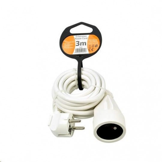 Kompaktný biely predlžovací kábel s dĺžkou 3 metre a jednou zásuvkou je ideálny na jednoduché predĺženie elektrickej energie v domácnosti, kancelárii alebo dielni. Vhodný na pripojenie samostatného zariadenia mimo dosah pevnej zásuvky.