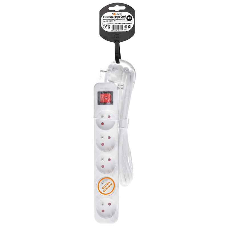 .Solight prodlužovací přívod, 5 zásuvek, bílý, vypínač, 3m