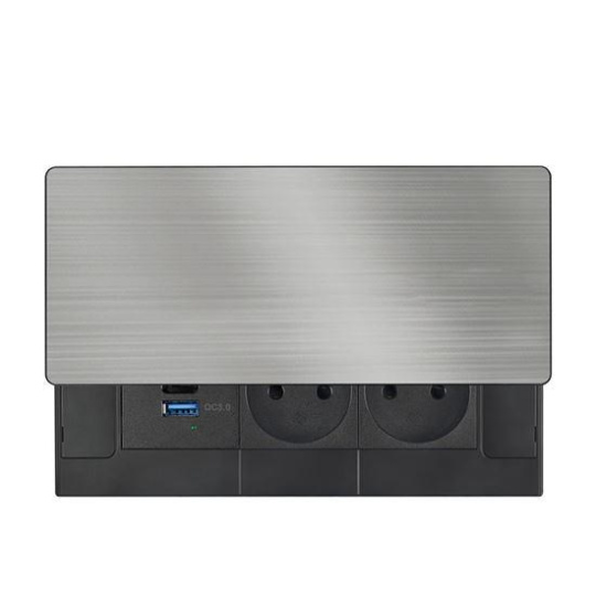 Vrchný kryt z matnej tmavej nerezovej ocele (inox) pôsobí elegantne a prirodzene zapadne do moderného interiéru. Nízky profil, čisté línie a nenápadné posuvné otváranie zachovávajú vzhľad pracovnej plochy. Zásuvky aj nabíjacie porty sú kedykoľvek ľahko prístupné jednoduchým pohybom ruky.