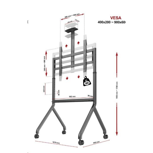 Mobilný stojan pre multimediálne tabule, interaktívne monitory a LCD LED TV 60" - 100" Model: NB P200G Stojan na interaktívnu tabuľu P200G Charakteristika: Univerzálny mobilný televízny vozík / stojan pre veľké obrazovky Perfektnejšie riešenie pre interaktívne tabule a multimediálne obrazovky Široká, stabilná základňa s jednoduchým prístupom k dotykovým obrazovkám Nastavenie výšky obrazovky Vysoko kvalitné materiály zabezpečujú veľmi pevnú a odolnú konštrukciu Výškovo nastaviteľná police na fotoaparát, kameru alebo iné AV techniky Prídavná polícia pod zástenu na príslušenstvo Plná zhoda so štandardom VESA Jednoduchá a rýchla montáž Ideálne do konferenčných miestností, škôl, výstav i pre súkromné použitie Štyri otočné gumové kolieska s funkciou aretácie Vysoká nosnosť, vynikajúca stabilita Stojan na multimediálne tabule a multimediálne dotykové monitory P200G TECHNICKÉ PARAMETRE Maximálna nosnosť 90,9 kg Pre obrazovky 60" - 100" Výškové nastavenie v rozsahu 145 ~ 170 cm (každých 5 cm) Gumové otočné kolieska s priemerom 75 mm s funkciou aretácie Pevná oceľová konštrukcia Nastaviteľná polícia na fotoaparát alebo inú AV techniku, rozmery: Rozmer 256 x 125 mm Spodná polícia na príslušenstvo, rozmery: 962 x 99 mm Povrchová úprava: práškový nástrek Farba: grafitová Štandard kompatibilný s VESA (rozostup montážnych otvorov): VESA 200x200 (rozstup otvorov 200 x 200 mm) VESA 300x200 (rozstup otvorov 300 x 200 mm) VESA 300x300 (rozstup otvorov 300 x 300 mm) VESA 400x200 (rozstup otvorov 400 x 200 mm) VESA 400x400 (rozstup otvorov 400 x 400 mm) VESA 600x400 (rozstup otvorov 600 x 400 mm) VESA 800x400 (rozstup otvorov 800 x 400 mm) VESA 800x500 (rozstup otvorov 800 x 500 mm) VESA 800x600 (rozstup otvorov 800 x 600 mm) VESA 900x600 (rozstup otvorov 900 x 600 mm)