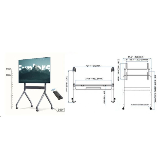 Kvalitný, veľmi pekný pojazdný televízny stojan s elektrickým pohonom na úpravu výšky obrazovky od 1500 mm do 1750 mm. Stojan má policu na príslušenstvo 962x99 mm s integrovaným ovládacím panelom, 4 otočné pojazdové kolieska s aretáciou a držiak TV s podporou VESA 200x200 až 900x600. Súčasťou balenia je aj diaľkové ovládanie. Vynikajúca oceľová konštrukcia s nosnosťou 90,9 kg zabezpečuje vynikajúcu pevnosť, stabilitu a odolnosť. Na stojan poskytujeme záruku 3 roky. Stojan na interaktívnu tabuľu / televízor / dotykovú obrazovku / monitor NB P220 Popis: Univerzálny mobilný stojan pre stredne veľké a veľké obrazovky Perfektné riešenie pre interaktívne tabuľe a multimediálne obrazovky Široká, stabilná základňa s ľahkým prístupom k dotykovým obrazovkám Elektrické nastavenie výšky obrazovky Kvalitné materiály, veľmi pevná a odolná konštrukcia Polica na príslušenstvo s ovládacím panelom Podpora štandardu VESA Jednoduchá a rýchla montáž Ideálne do konferenčných miestností, škôl, na výstavy, prezentácie, prednášky alebo na súkromné použitie Štyri otočné kolieska s funkciou aretácie Vysoká nosnosť, skvelá stabilita, tichý a spoľahlivý motor Farebné prevedenie grafit Elektrický stojan na multimediálne tabule a multimediálne dotykové monitory NB P220 Technické údaje: Nosnosť 90,9 kg Pre obrazovky 60" - 100" Podpora VESA štandardov 200x200 až 900x600 Výškové nastavenie v rozsahu 150 ~ 175 cm Otočné kolieska s priemerom 75 mm s funkciou aretácie Pevná oceľová konštrukcia Spodná polica na príslušenstvo s ovládacím panelom, rozmery: 962 x 99 mm Dálkové ovládanie Výkonný motor 75W Napájanie 240V / 110V Povrchová úprava: práškový náter Farba: grafitová Záruka 3 roky