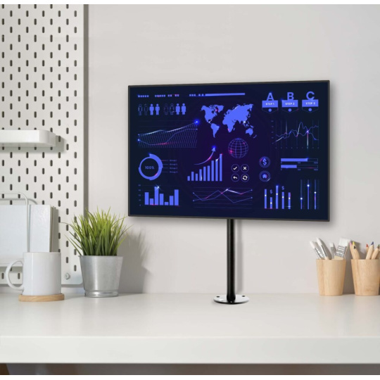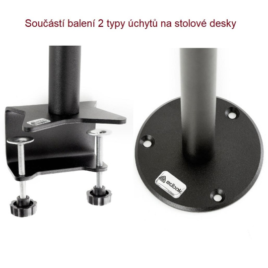 Stolný držiak na dotykové monitory EDBAK SV30 Držiak na TV a monitory 15-43", nastaviteľná výška 280-450mm, nastavenie náklonu -30°/+90°, otáčanie do strán +/-180°, 2 typy stolových uchýtov, VESA 75x75 a 100x100, nosnosť 10kg Stolný držiak pre monitory a televízie 15-43", ktorý vyniká svojou vynikajúcou kvalitou, nastaviteľnosťou a aretáciou obrazovky v nastavenej polohe. Nastaviteľná výška v rozmedzí 28-45cm od stolovej dosky, otočenie do strany +/- 180°, naklápanie v širokom rozsahu od -30° až do +90° (obrazovka vodorovne). Držiak je dodávaný so 2 typmi stolového uchytenia - svorka pre uchytenie na okraje stolov a hliníková skruž s otvormi na ukotvenie do stolovej dosky. Držiak podporuje VESA štandardy 75x75 a 100x100 a má nosnosť 10kg. Vďaka pevnej konštrukcii a aretácii polohy je držiak vhodný nielen na monitory a televízie, ale aj na dotykové obrazovky. Záruka 5 rokov. Stolný držiak na monitory EDBAK SV30 Technické údaje: nosnosť 10kg vhodný pre monitory, televízie a dotykové obrazovky 15" - 43" podporuje VESA štandardy 75x75 a 100x100 nastaviteľná výška 280 až 450mm otočný +/- 360° sklopný +90°/-30° voľba vhodného typu uchytenia na stolovú dosku - na okraj alebo do priestoru fixácia v požadovanej polohe ľahká inštalácia farebné vyhotovenie čierne záruka 5 rokov Stolné držiaky na monitory alebo televízie Edbak SV30 Držiak podporuje VESA štandardy na uchytenie monitorov: VESA 75x75 VESA 100x100 Na držiaky EDBAK SV30 je možné zavesiť všetky monitory a televízory, ktorých hmotnosť je maximálne 10kg a ktoré podporujú niektorý z vyššie uvedených VESA štandardov. Výška televízie alebo monitora (nie uhlopriečka) nesmie byť väčšia ako 36cm.