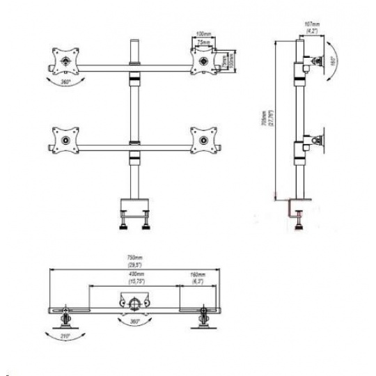 Technické údaje: < “maximálne celkové zaťaženie 40kg” > < “na monitory s uhlopriečkou až 30” > < “podporuje VESA štandard 75x75 a 100x100” > < “posun monitora po osi držiaka” > < “nastaviteľná výška oboch súprav monitorov” > < “sklon monitoru až 160st.” > < “otáčanie do strán až 70st.” > < “funkcia pivot - horizontálne aj vertikálne natočenie obrazovky” > < “dodávame vrátane 2 typov uchytenia na stolovú dosku” > < “uchytenie na stolovú dosku o sile 10-70mm” > < “farba strieborná alebo čierna” > < “záruka 5 rokov” > < “Profesionálne stolové držiaky na 4 monitory EDBAK podporujú VESA štandardy:” > < “VESA 75x75” > < “VESA 100x100” > < “možnosť dokúpenia VESA 200x100” > < “možnosť dokúpenia VESA 200x200” >