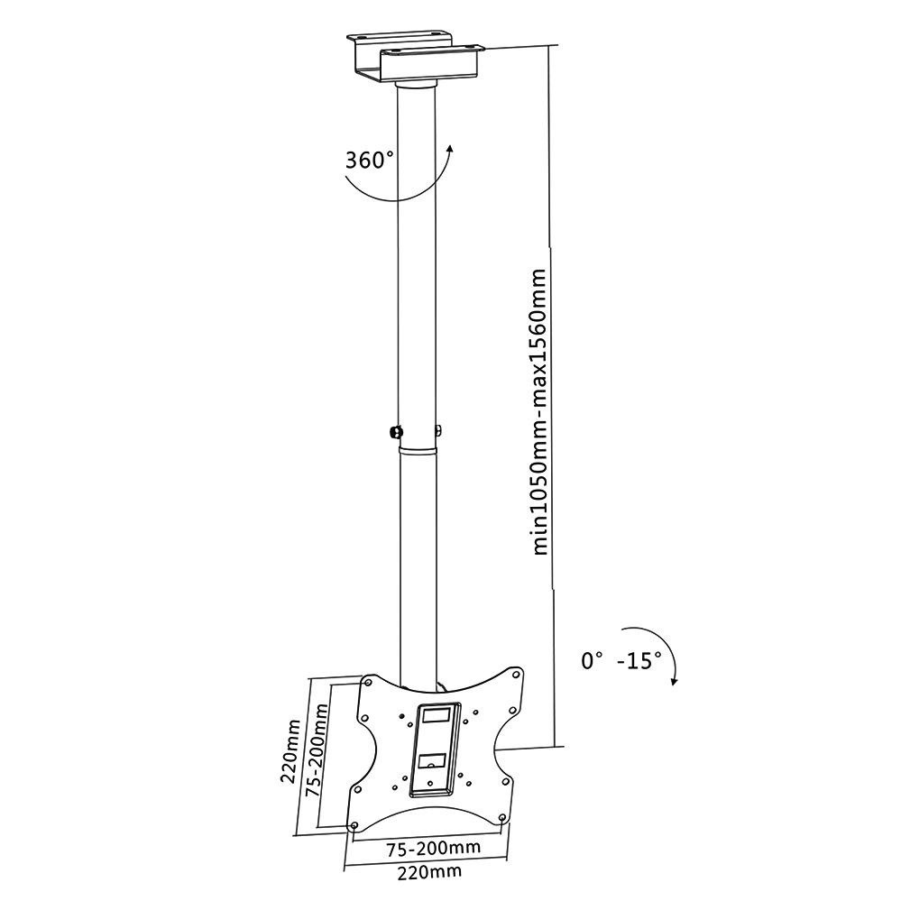 Držiak na televízie a monitory Fiber Novelty C200 Stropný držiak na zavesenie televízorov a monitorov 23" až 50", nastavenie dĺžky 105-156cm, otočný, sklopný, VESA 75x75 až 200x200, nosnosť 50kg Kvalitný stropný držiak, ktorý je vhodný na menšie a stredne veľké televízory a monitory s uhlopriečkou 23" až 50". Držiak poskytuje širokú škálu nastavení - vzdialenosť od stropu v rozmedzí 105 - 156cm, otáčanie do strán a náklon. Montáž je veľmi jednoduchá a rýchla, zavesenie televízora je veľmi bezpečné. Držiak umožňuje skryté vedenie káblov vo vnútri nosnej konštrukcie. Súčasťou balenia je montážny materiál - skrutky, vruty, hmoždinky. Nastaviteľná výška stropného držiaka na TV a monitory FN-C200 Technické údaje: maximálne zaťaženie 50kg VESA štandard 75x75, 100x100, 200x100, 200x200 odporúčame na televízie a monitory s uhlopriečkou 23" až 50" nastaviteľná vzdialenosť od stropu 105 - 156cm natočenie do strán +360° až -360° náklon 0° až -15° ľahká montáž a rýchla montáž systém pre skryté vedenie káblov výborná kvalita farba čierna záruka 5 rokov Stropný držiak na TV Fiber Novelty C200 podporuje VESA štandardy: VESA 75x75 VESA 100x100 VESA 200x100 VESA 200x200 Stropný držiak na TV s nastaviteľnou dĺžkou, nastaviteľným sklonom a vedením káblov - Fiber Novelty FN-C200 Držiak na stropné zavesenie TV Fiber Novelty C200 je vhodný na zavesenie všetkých televízorov a monitorov, ktoré majú hmotnosť do 50kg a podporujú niektorý VESA štandard podľa tabuľky vyššie. Uvádzaná odporúčaná uhlopriečka nie je podstatná, len informatívna, aké veľké obrazovky by mali byť vhodné.