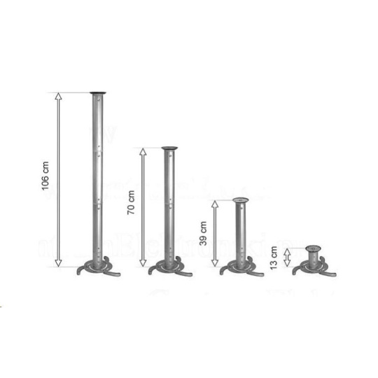 Kompletná špecifikácia Stropný držiak projektora Fiber Mounts M5C17 Dĺžkovo nastaviteľný, otočný, sklopný držiak projektora na strop, strieborný, nosnosť 10kg, univerzálny na všetky bežne dostupné projektory Stropný držiak projektora s nastaviteľnými vzdialenosťami od stropu Fiber Mounts M5C17 Univerzálny, kvalitný polohovací držiak na stropné zavedenie projektorov a dataprojektorov. Držiak je vhodný na 99% všetkých dostupných projektorov. Súčasťou balenia sú dĺžkové nástavce, vďaka ktorým je projektor možné zavesiť od stropu v dĺžke od 13 až do 106cm, nakloniť o 15° a otáčať do strán. Držiak je vyrobený z hliníku. Farebné prevedenie strieborné. Držiak pre stropné upevnenie projektora Fiber Mounts M5C17 Technické údaje: nosnosť 10kg univerzálny, vhodný na 99% bežne dostupných projektorov náklon +/- 15° natočenie do stan +/- 360° nastaviteľná dĺžka od stropu 13, 39, 70 alebo 106cm farba strieborná hliníková konštrukcia záruka 2 roky