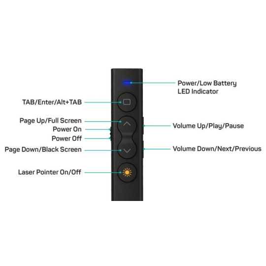 | Funkcie prezentéra | - TAB/ENTER/ALT+TAB - PAGE UP/FULL SCREEN - PAGE DOWN/BLACK SCREEN - VOLUME UP/PLAY/PAUSE - VOLUME DOWN/NEXT/PREVIOUS |