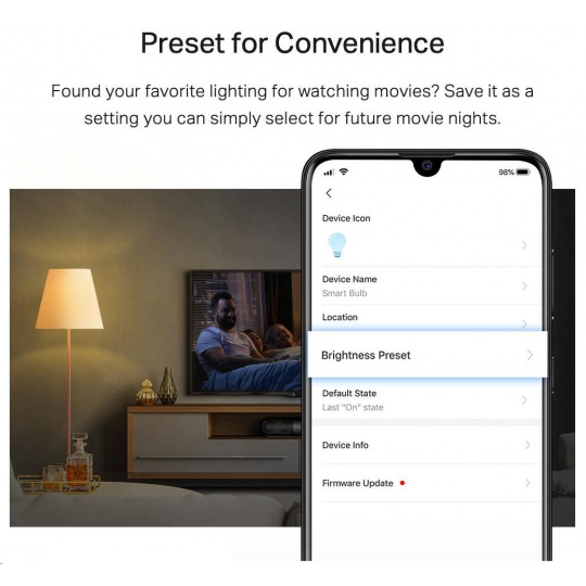 - Stmievanie (nastavenie pre vaše pohodlie) – Našli ste svoje obľúbené osvetlenie na sledovanie filmov? Uložte si ho ako nastavenie, ktoré si môžete jednoducho vybrať pre budúce filmové noci.