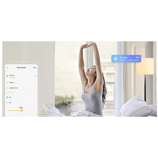 - Časový plán (nastavte si časy) – Vytvorte si pravidelný plán na zapnutie/vypnutie s nastaviteľnou jasom.