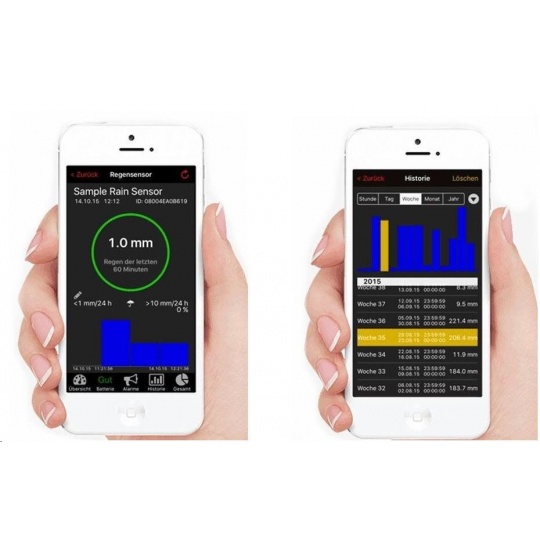 umožňuje pomocou mobilnej aplikácie okamžité sledovanie zrážok. Aplikácia Vás upozorní na prekročenie vopred nastavené hodnoty maximálnych zrážok pomocou správy na vašom mobilnom zariadení.
