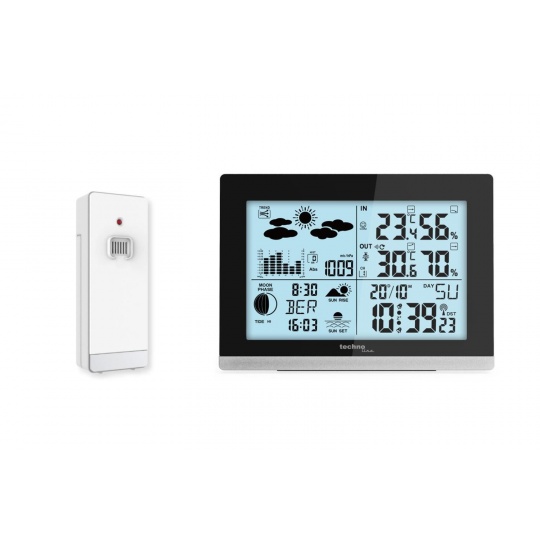 - veľkosť číslic na displeji – čas 17 mm, dátum, skratka názvu dňa 9 mm, vnútorná a vonkajšia teplota a vlhkosť 15 mm, barometrický tlak 9 mm, skratka názvu mesta 8 mm, čas východu a západu Slnka 7 mm