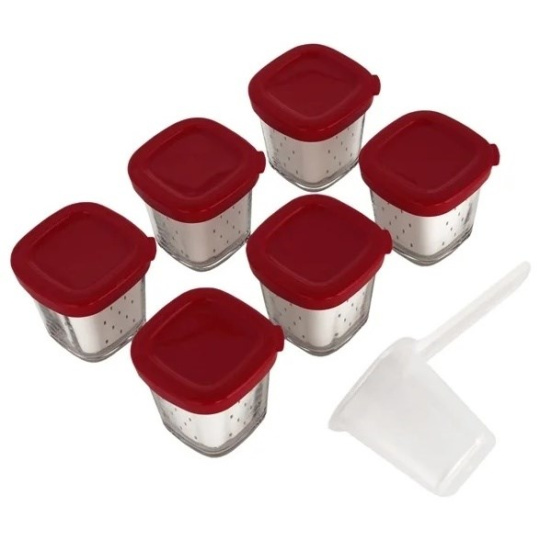 Současťou balenia je 6 nádob po 140 ml s víčkom a sitkom a tiež podnos s úchytmi, ktorý je možné použiť na uloženie 6 pohárov pre jednoduchú prepravu v chladničke. Môže sa umývať v umývačke riadu a 100 % neobsahuje BPA